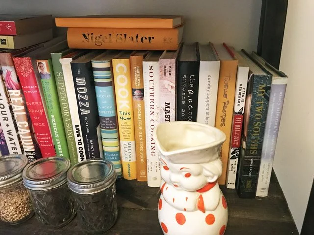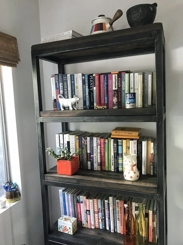 Looking at all my cookbooks spread out, and then at the empty shelf (which Craig purchased at H.D. Buttercup and which he gladly AHEM reluctantly donated to my kitchen back in 2013) I decided that it was time to shake things up.