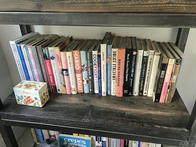 Now let’s talk about the third tier. Things changed from my original plan: dessert books moved up a shelf and now share space with the warhorses. These are the books that’ve been with me the longest, in a way… the Inas, the Marios, the Lidias. These books are still stalwarts in the kitchen. I’ll pull down an Ina anytime I want to make a solid meal without too much fanfare. And Mario’s always a good resource for authentic Italian, as is Lidia. The dessert books–the ones that SURVIVED–are on the right.