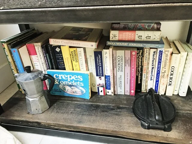 Since you last knew me, I’ve developed a few food-related obsessions. The first one is plates. I collect vintage plates now on Ebay and Etsy and I have quite a collection (OK, here’s a peek on Instagram). I’m also obsessed with old cookbooks, usually ones that have historic value (The Lutece Cookbook, for example) but sometimes I purchase cookbooks that are pretty campy and semi-historic (The Uta Hagen Cookbook, The Liberace Cookbook, The Lifestyles of the Rich and Famous Cookbook). Those collectible cookbooks held the highest position on my old cookbook shelf, a shelf that was beginning to look like a real mess. Here’s what I’m talking about…