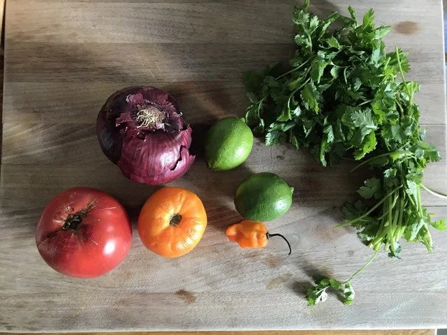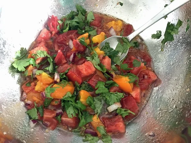 Well, except the tortillas and the eggs. These are just the ingredients for the salsa, which is really a matter of taste: chop a tomato or two. It’s prettier if you use heirloom tomatoes. Then add some chopped red onion. And, the key ingredient, a finely minced habanero (less if you don’t like spicy, more if you do). Before Bayless’s show, I was scared of habaneros; but using it here, it added so much to the flavor of the dish, a kind of fruity heat (the kind of heat I generate too). Add chopped cilantro, FRESH lime juice (no bottled, please), a glug of olive oil, and a pinch of salt.