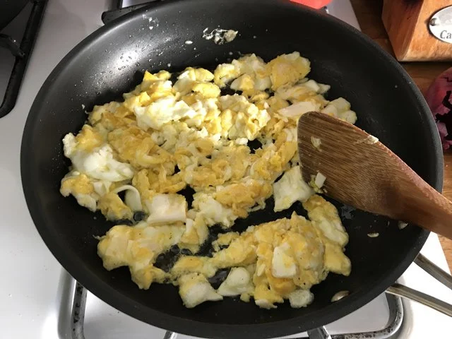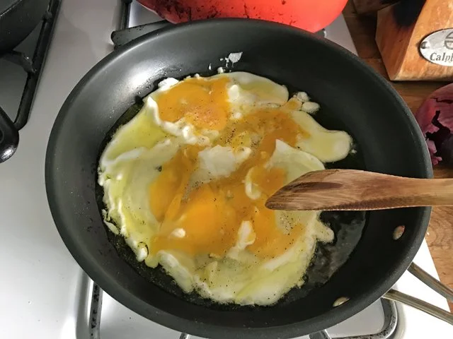 Once you have your salsa, you can do your eggs. Bayless heated a little olive oil in a pan and then cracked the eggs (two) directly into it, breaking up the yolks as they cooked so you get streaks of yellow and white, which I thought was pretty cool (don’t forget salt and pepper):