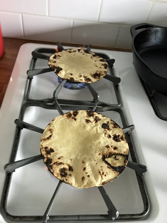 Lay your corn tortillas (buy the best you can get, look in the refrigerated section) directly on the gas burners and turn on the heat. Watch as they char around the edges and flip, repeatedly, with tongs, until they look something like this: