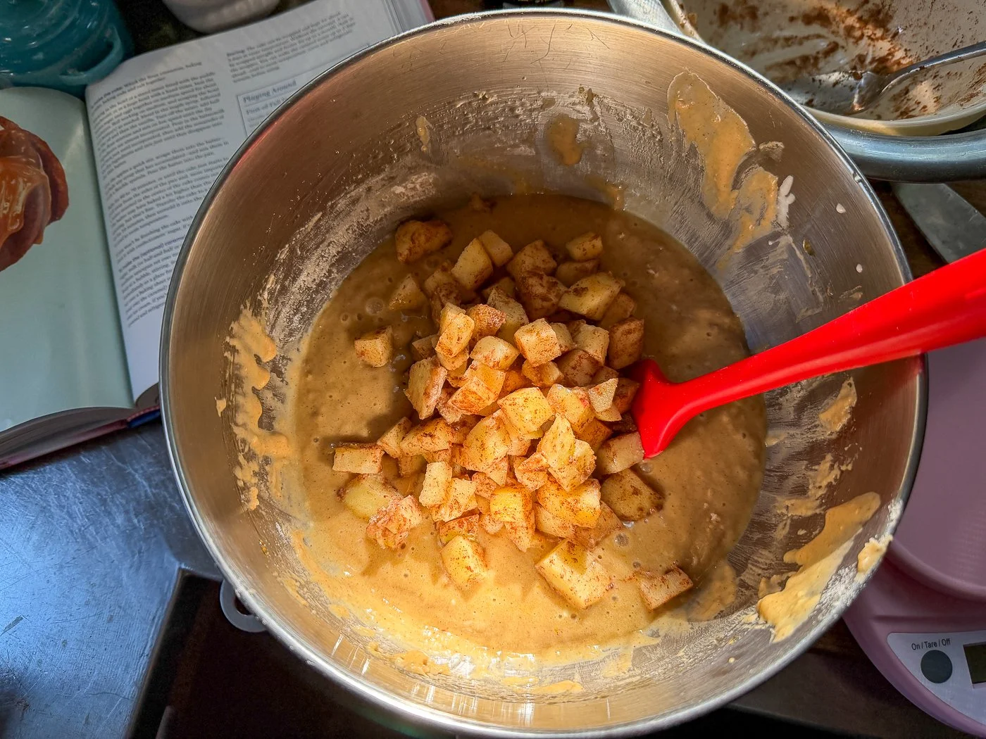 Once you complete the batter — with flour, cinnamon, baking powder, baking soda, sea salt, and buttermilk (I actually used full-fat yogurt) — you add your apples.