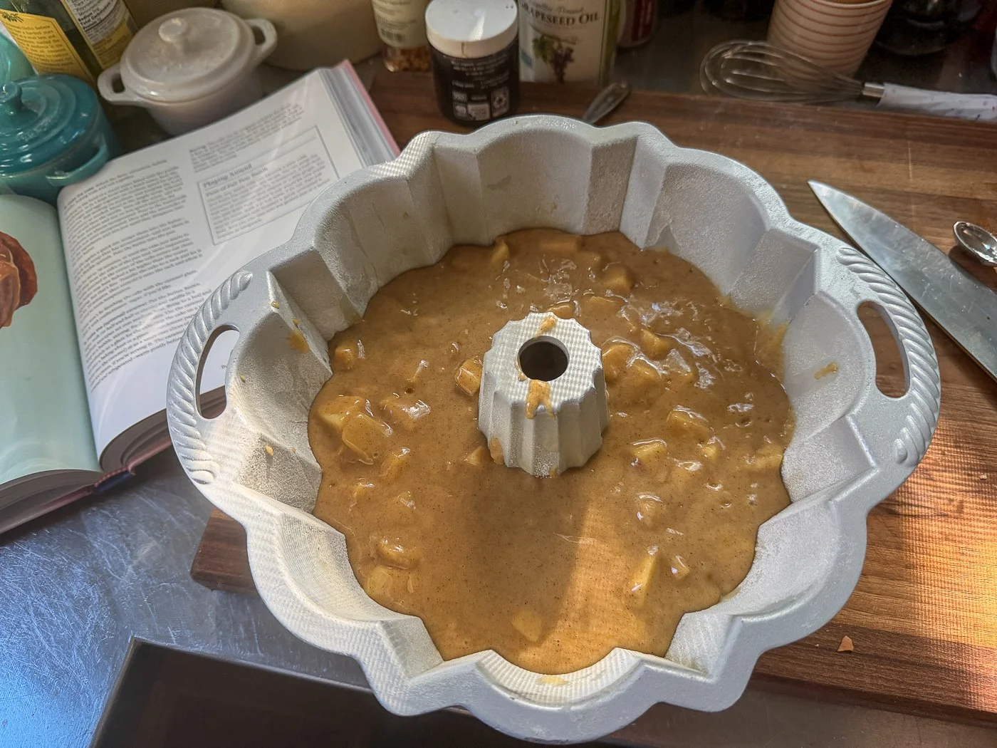 Then it’s just a matter of folding those apples in and pouring the batter into your well-prepped Bundt pan.
