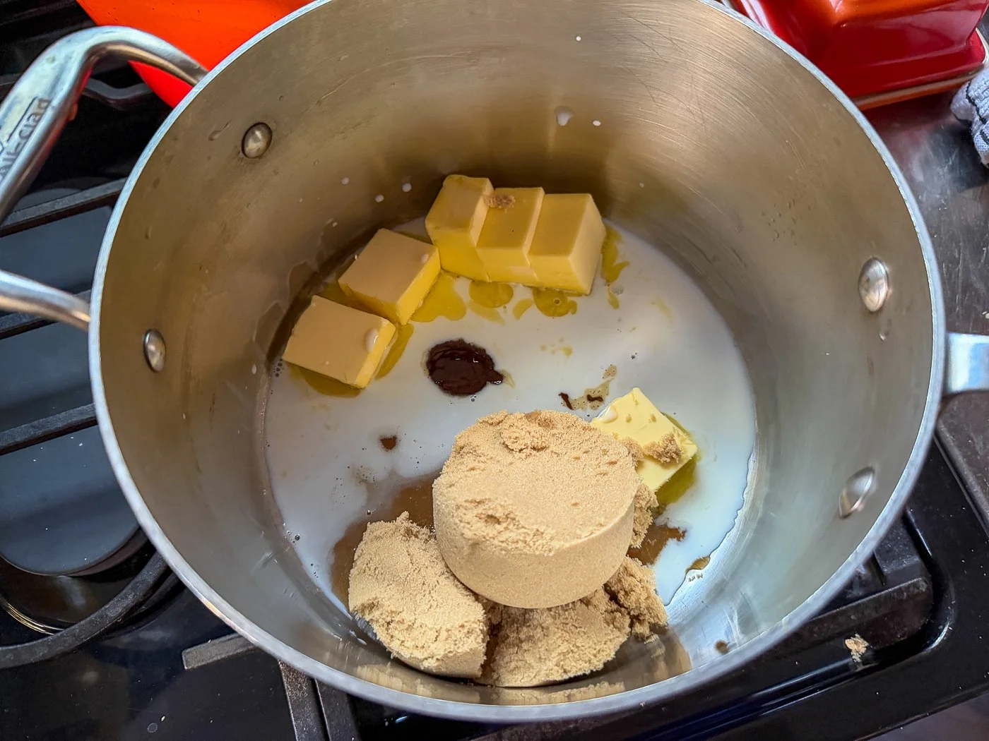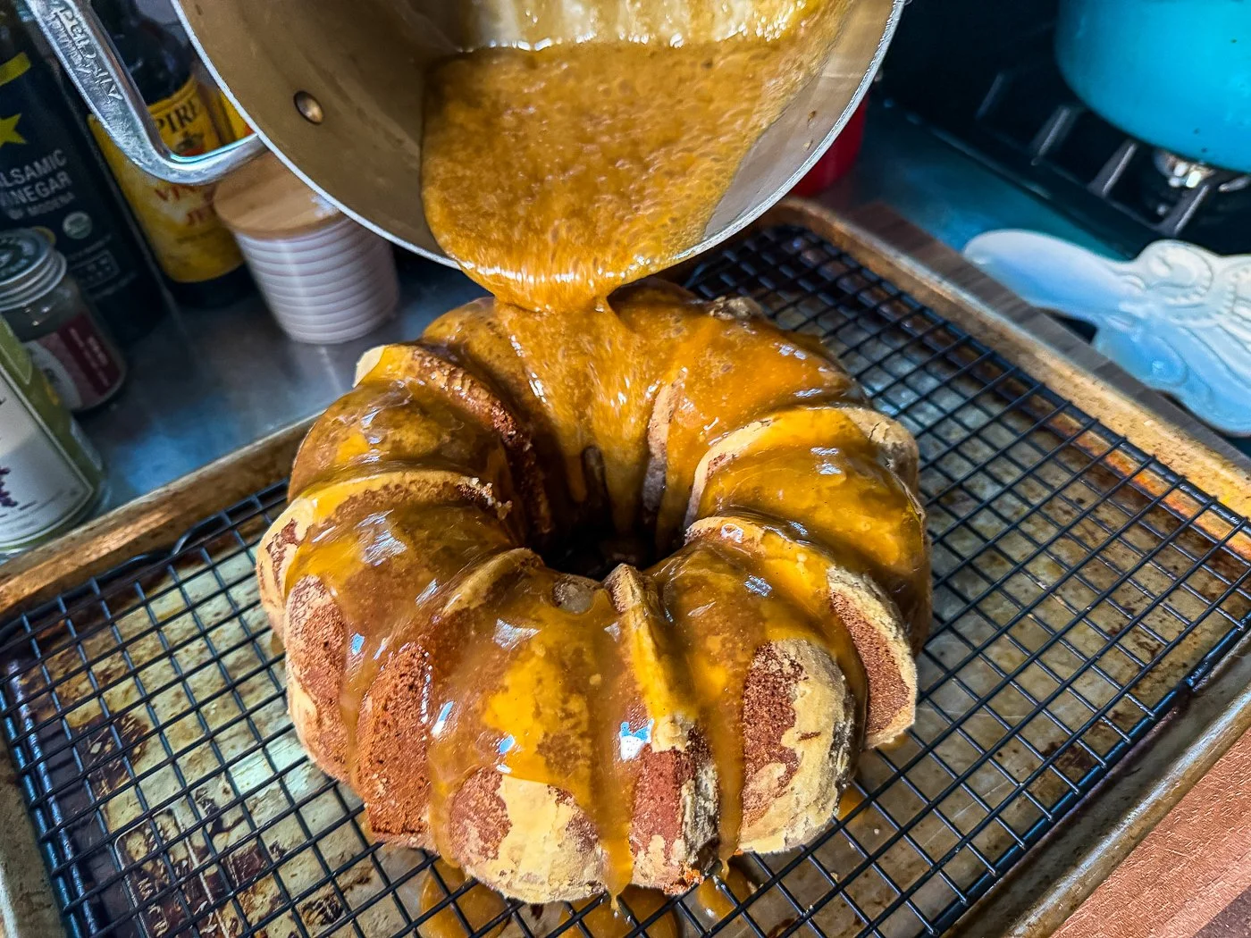 - To make the caramel: Put the butter, brown sugar, milk (or half-and-half or cream) and vanilla in a medium saucepan set over medium heat. Bring to a boil and keep at a bubble, stirring, for 2 minutes. Use the caramel immediately as a glaze for the cake (put the cake on a rack set over a baking sheet or a piece of parchment paper and pour over the caramel) or as a sauce over slices of cake, or over ice cream, if you’re serving it.