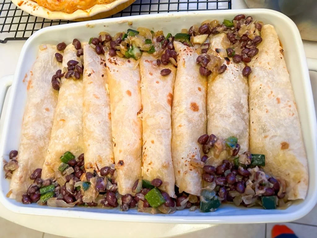 A riff on Ali Slagle’s enchilada recipe with flour tortillas, black beans, and two cheeses.
