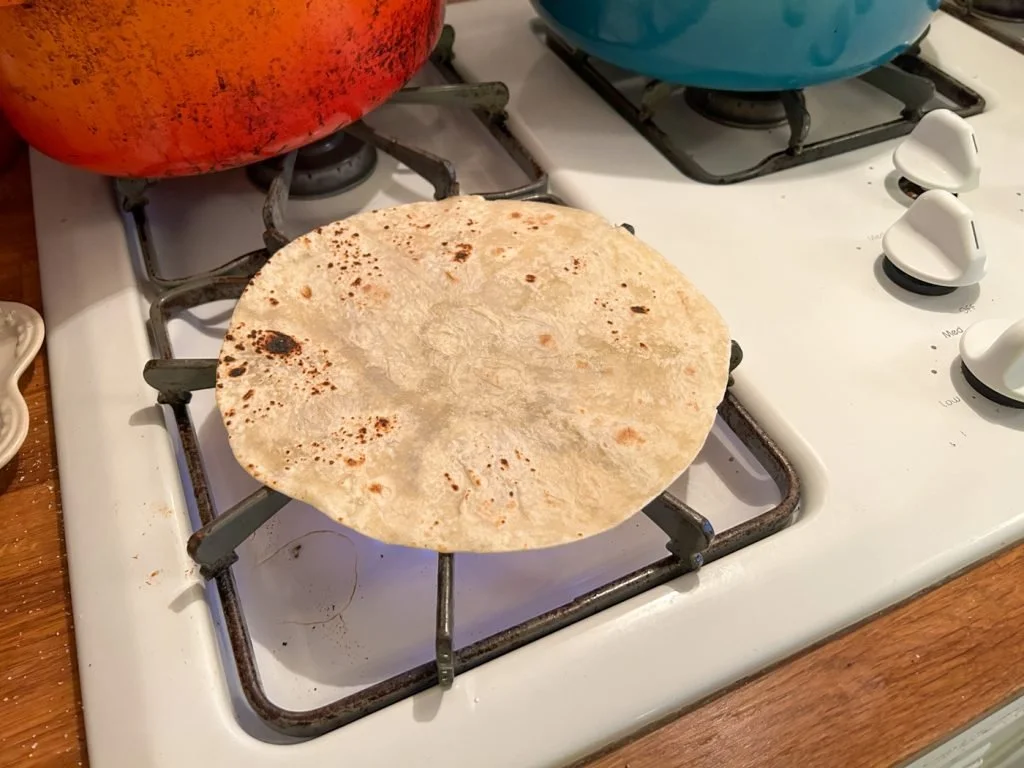 The one thing that I brought to the table enchilada-wise (lol) was the concept of charring the flour tortillas before rolling them. I love doing this. It’s the main reason I’d miss a gas stove. You just lay the flour (or corn) tortilla directly on the gas flame, flip it with tongs, until it gets some charry spots.