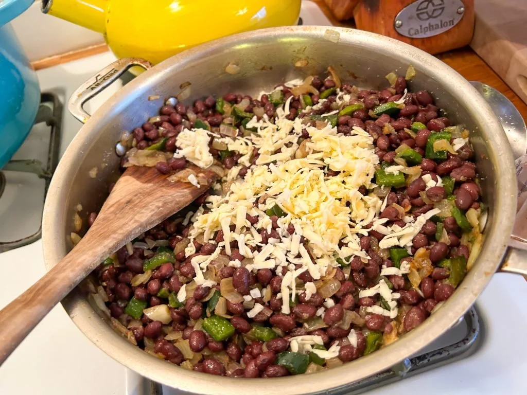 Add the black beans to the vegetables in the skillet and sauté a little bit with a little more salt and pepper, tasting to adjust. (My secret? I sometimes add a tiny splash of Balsamic to round them out, but that’s just between us.) Turn off the heat and stir in 1/2 cup of the cheese.
