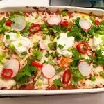 Pour the remaining sauce on top and top with the remaining cheese. Bake until the cheese is melted, about ten minutes. If you want it a bit more charred on top, turn on the broiler and watch it carefully. Garnish with big dollops of sour cream, pickled chilies, radishes, cilantro, and scallions.
