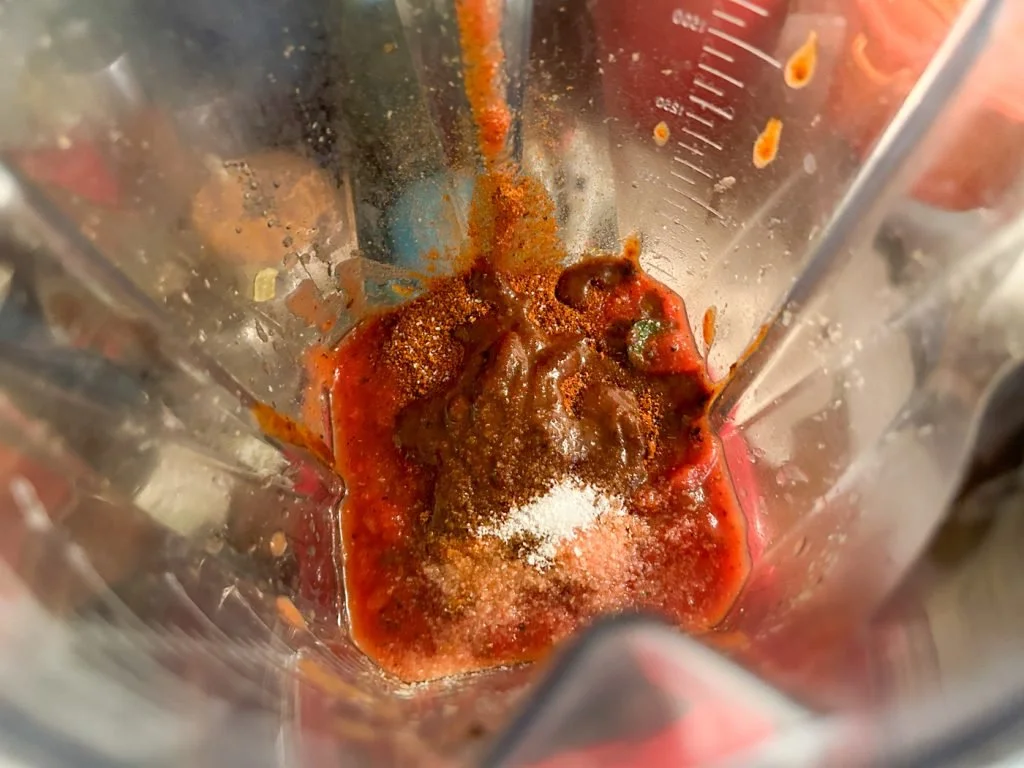 Transfer half of the vegetables to a blender and blend with the tomatoes, chili powder, and hot sauce. Taste and adjust with salt. (If the mixture is too thick, add a splash of water or, according to Ali Slagle, 1/4 cup sour cream to make it looser.)