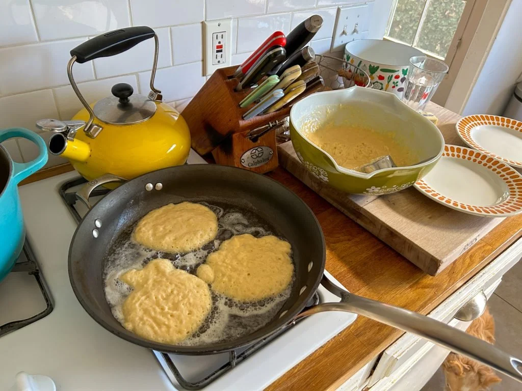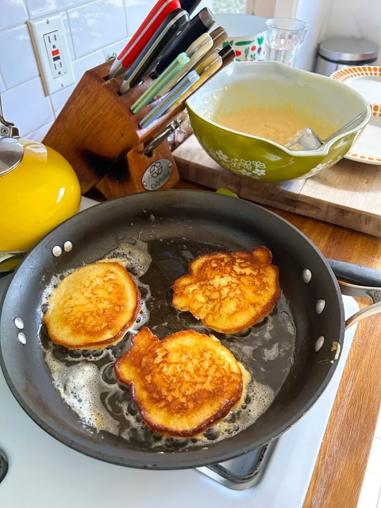 Using a 1/3rd cup measure, scoop the batter into the hot pan — leaving some space between each pancake (I did four at a time). Bubbles will form on the tops of the pancakes; wait to flip them until most of the bubbles have popped and the pancakes are golden brown underneath (about 3 minutes). Flip and cook another minute or two until golden on the other side. Transfer to a plate and repeat with the remaining pancakes, adding more butter and oil as needed.