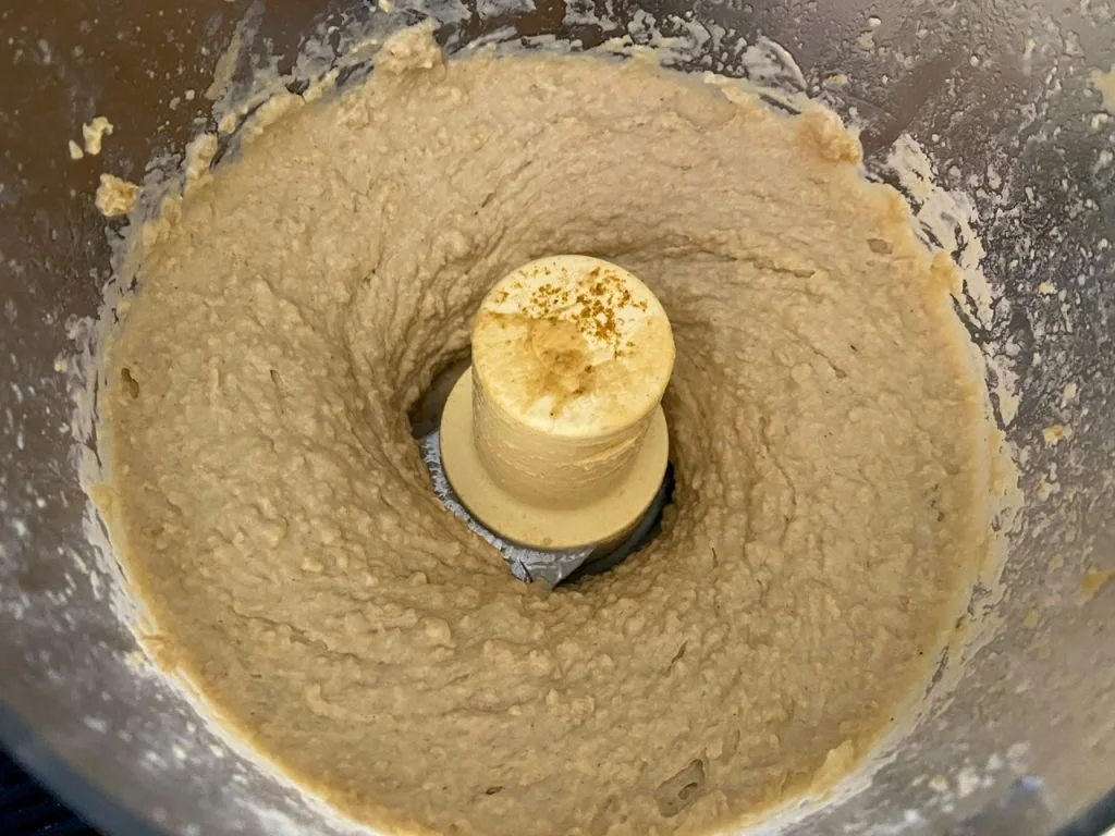 Place the cashews, salt, lemon juice, garlic, cumin, and tahini into a food processor and blend into a paste. Slowly add the reserved cooking liquid through the feed tube to achieve a creamier consistency. Taste and adjust for salt and lemon.