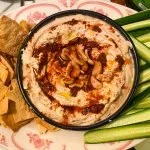 To serve: scoop the hummus into a serving bowl and create a big well in the center. To the well, add the harissa, whole cooked cashews, and smoked paprika. Drizzle on the olive oil, sprinkle on the parsley and scallions, and serve.