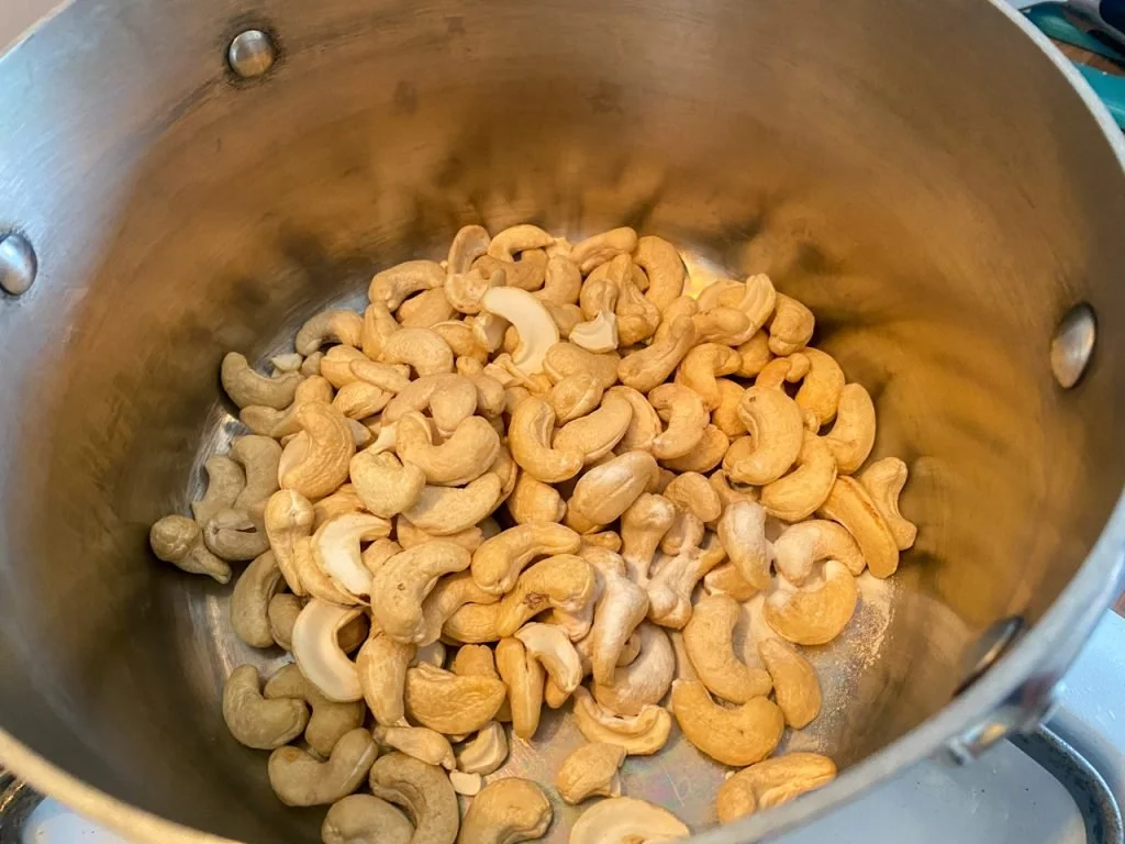 Use a slotted spoon to scoop out 1/3 cup of the cashews and transfer them to a small bowl to cool. Continue to cook the remaining cashews until they’re very soft and start falling apart and most of the liquid has been absorbed, 5 to 10 minutes more. You should be able to smoosh a cashew easily against the side of the pot with almost no pressure. Drain the cashews, reserving 1 cup of the cooking liquid.