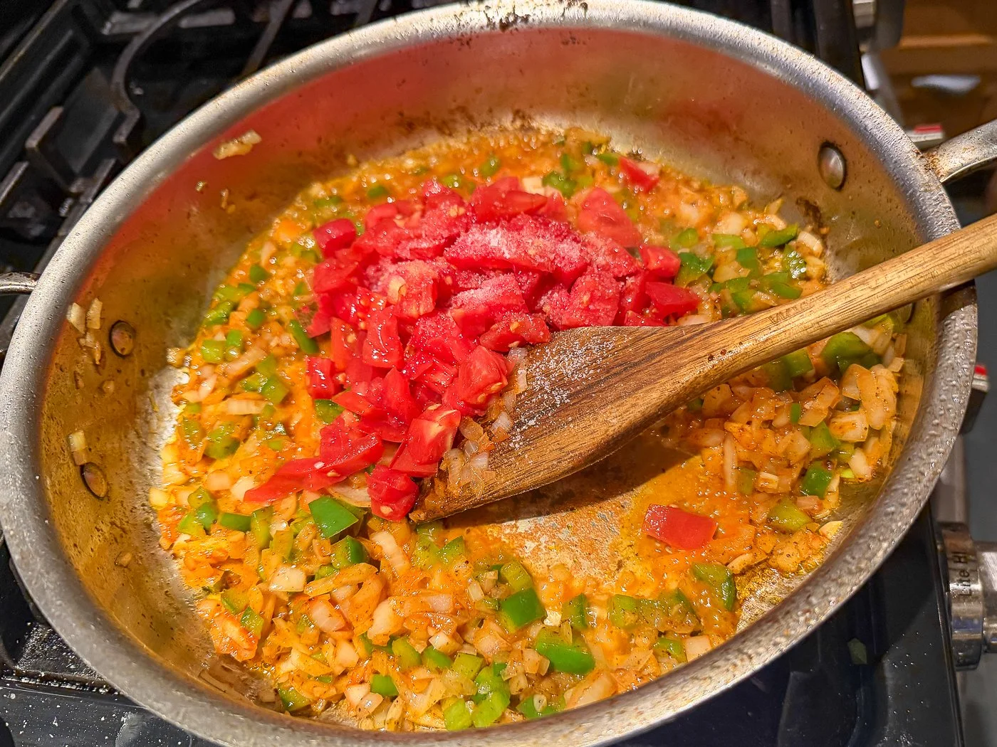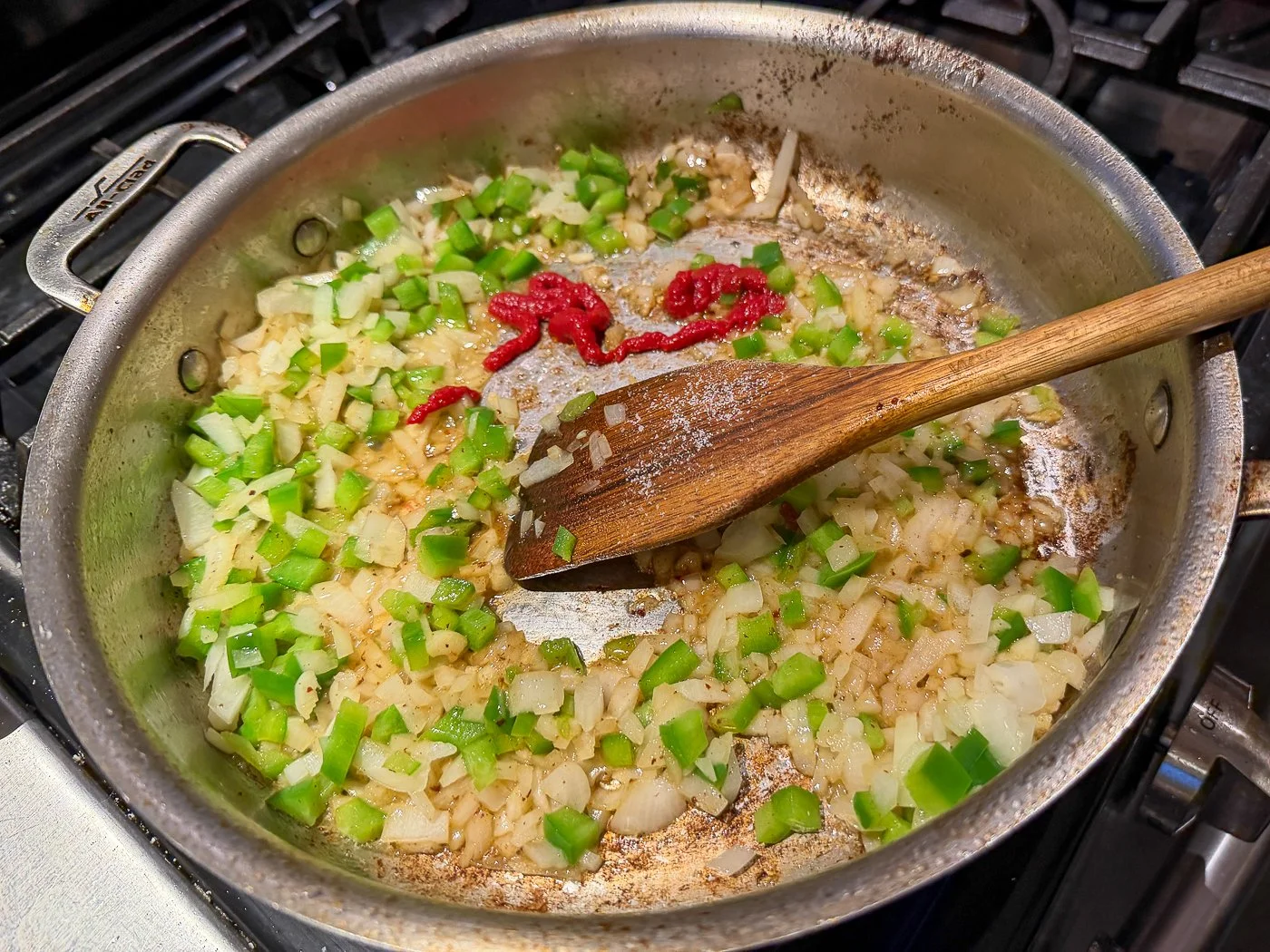 The main difference between the Lee Brothers recipe and Julia Reed’s recipe is bacon: the Lees have it, the Reeds don’t. I’m team bacon. So after rendering a bunch of lardon until crisp, you remove them to a bowl and sauté your onions, green peppers, and garlic. Then I toasted some tomato paste in there too — my own idea, stolen from Lidia Bastianich pasta recipes — before adding a whole chopped tomato.