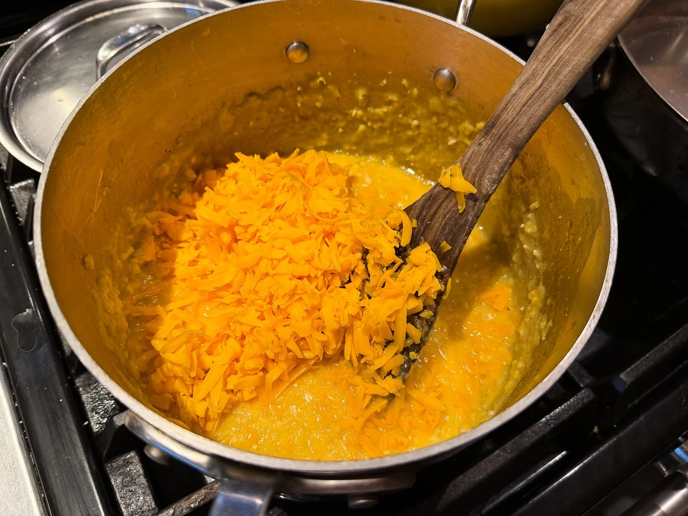 Cooking the grits is a little bit of a project. You have to soak them overnight — well you don’t have to, but you should — and then they cook for at least an hour, with additions of hot water ever ten minutes. It took a lot of babysitting but once I added butter, salt, and two handfuls of grated cheddar cheese? I was instantly transported back to the South.