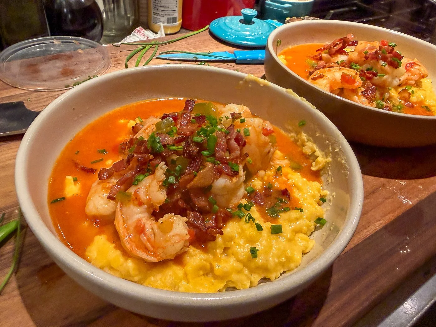 - Ladle the grits into bowls, smooth out, then top with the shrimp and lots of the sauce. Sprinkle with the bacon and the chives or parsley and serve right away.