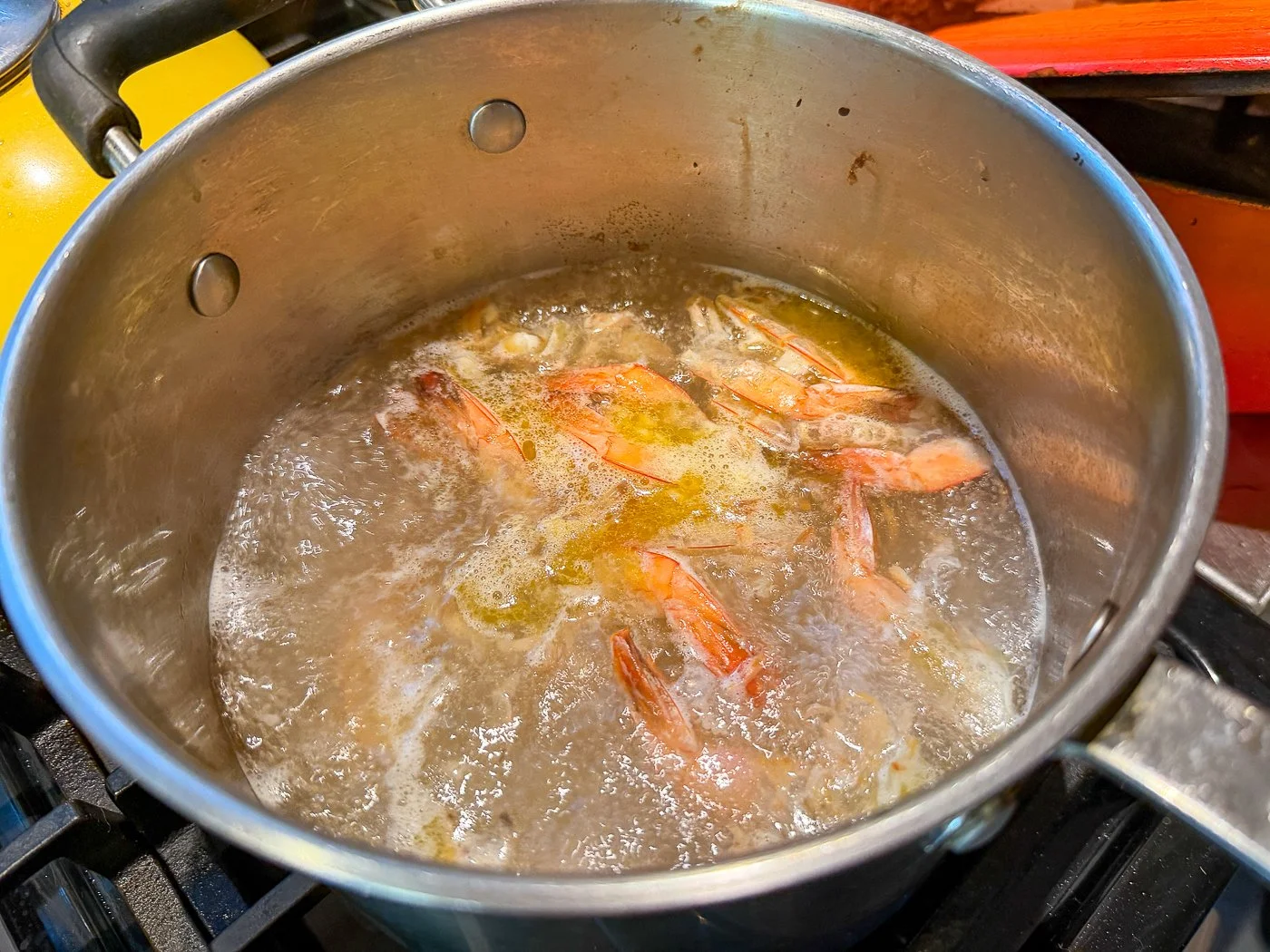 Both recipes begin with the same step: you make a shrimp stock using the shells of the fresh shrimp that you should de-shell and de-vein before starting. I cribbed a technique from David Tanis and toasted the shells a little in olive oil with garlic before adding the water, just for a little more flavor. Once that reduces by half, you strain it and set that liquid gold aside.