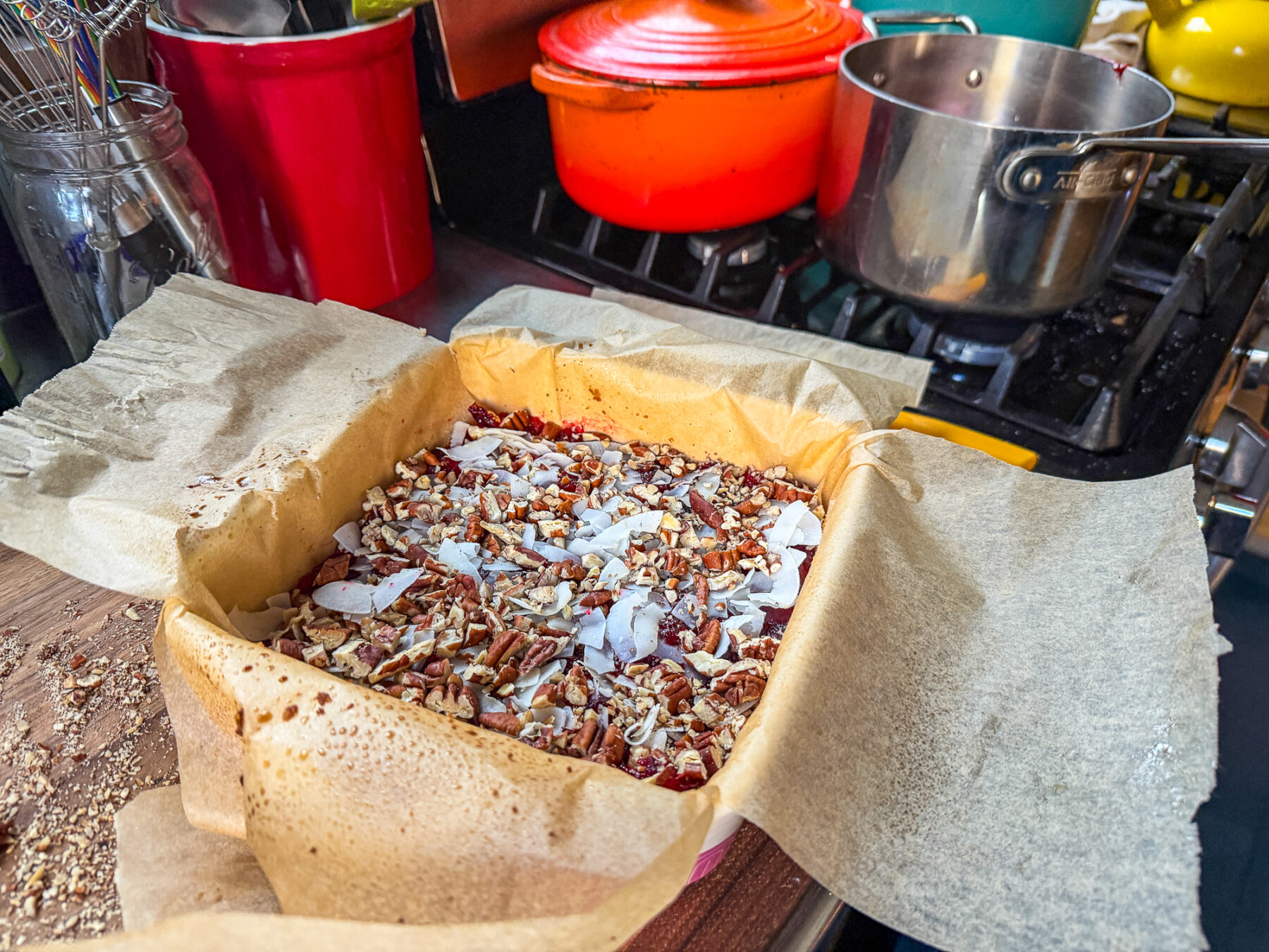 Now comes the fun stuff. What puts the “magic” in cranberry magic bars? Toasted pecans, coconut, and chocolate.