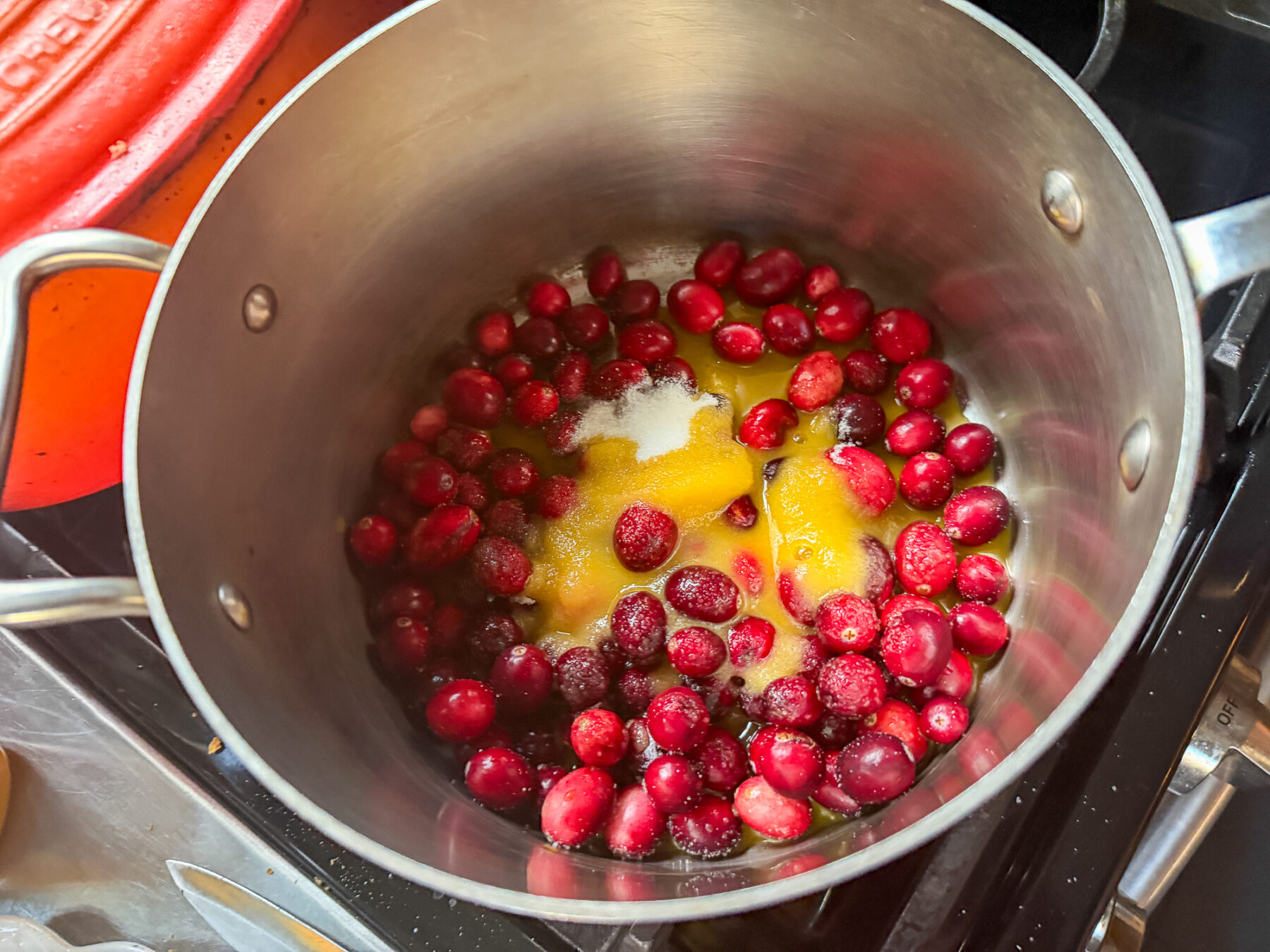 5. Meanwhile, combine the cranberries, orange juice, and the remaining ½ cup (104 g) sugar in a small saucepan and bring to a boil over medium heat. Boil, stirring occasionally, until the mixture is the consistency of jam and has reduced to 1 cup, 8 to 10 minutes.