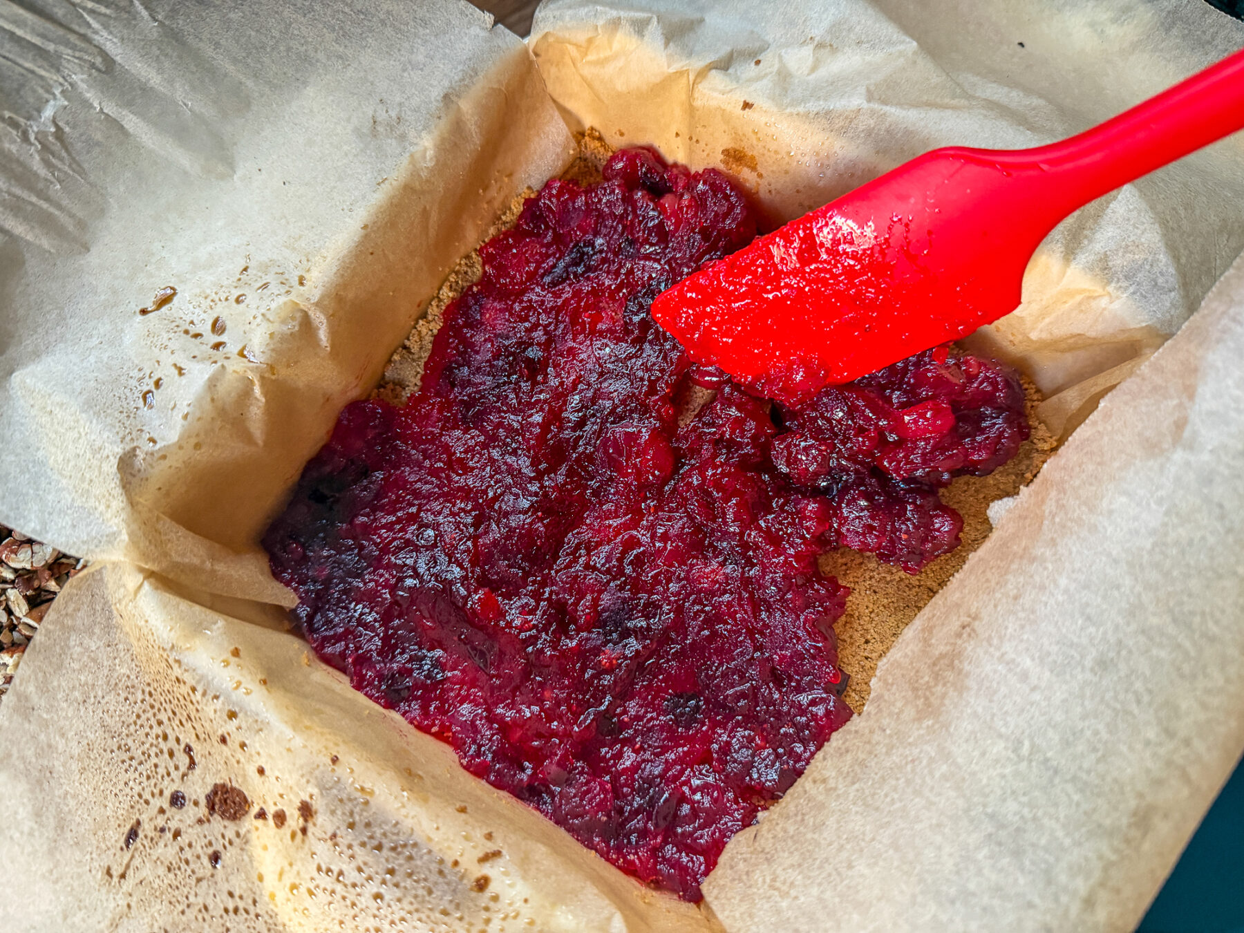 Next up, a layer of cooked cranberries that might look a lot like the cranberry sauce you served on T-Day.