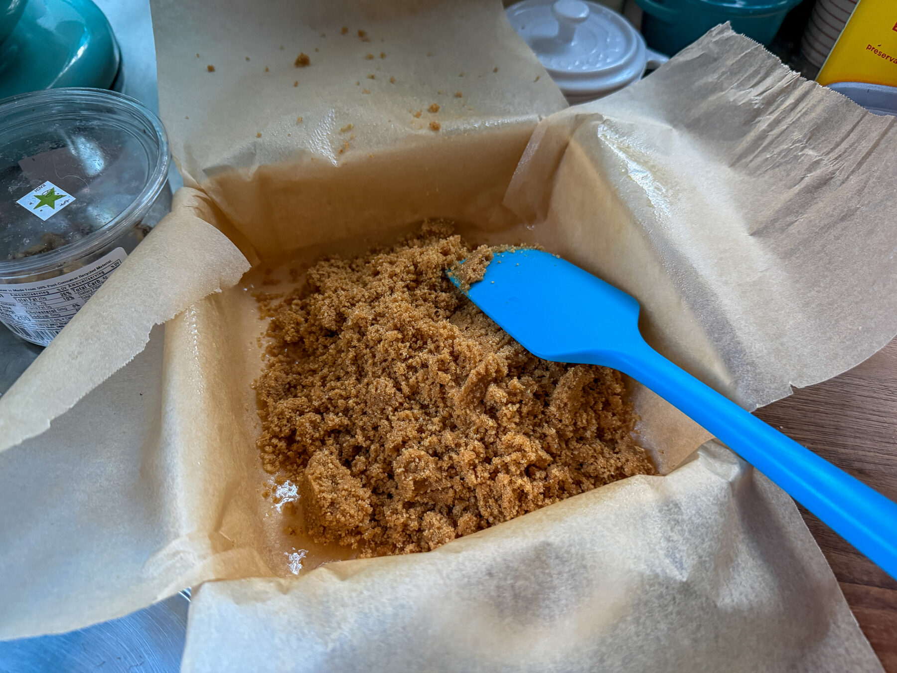 3. Transfer the mixture to the prepared pan and press into an even layer. To get a completely flat bottom, press in the mixture with the bottom of a dry measuring cup.