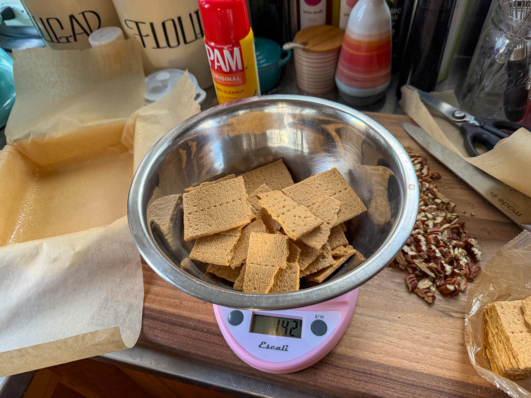 I’m all about transitional recipes and these bars whisk us from turkey season to ho ho ho times. You start with a standard graham cracker base, plus a few toasted pecans for good measure.