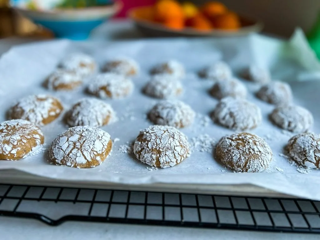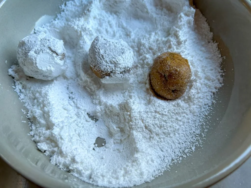 Once the dough comes together (you beat eggs in a mixer with the sugar before working in the other ingredients), you refrigerate it for a few hours so it firms up, and then you scoop tablespoon-sized balls and roll them in both granulated sugar and then powdered sugar.