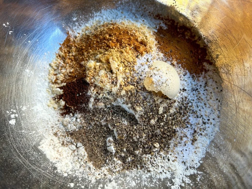 Whisk together the flour, malted milk powder, baking powder, ginger, cinnamon, cardamom, cloves, salt, and pepper in a medium bowl.