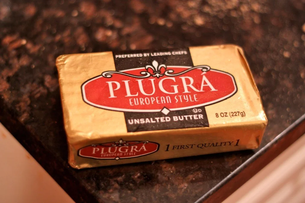 That, there, is Plugra, European-style butter. Unlike conventional butter, its fat content is much higher. As someone pointed out, either on Twitter or in real life (I get the two confused) it has a bit of a sour edge to it.
