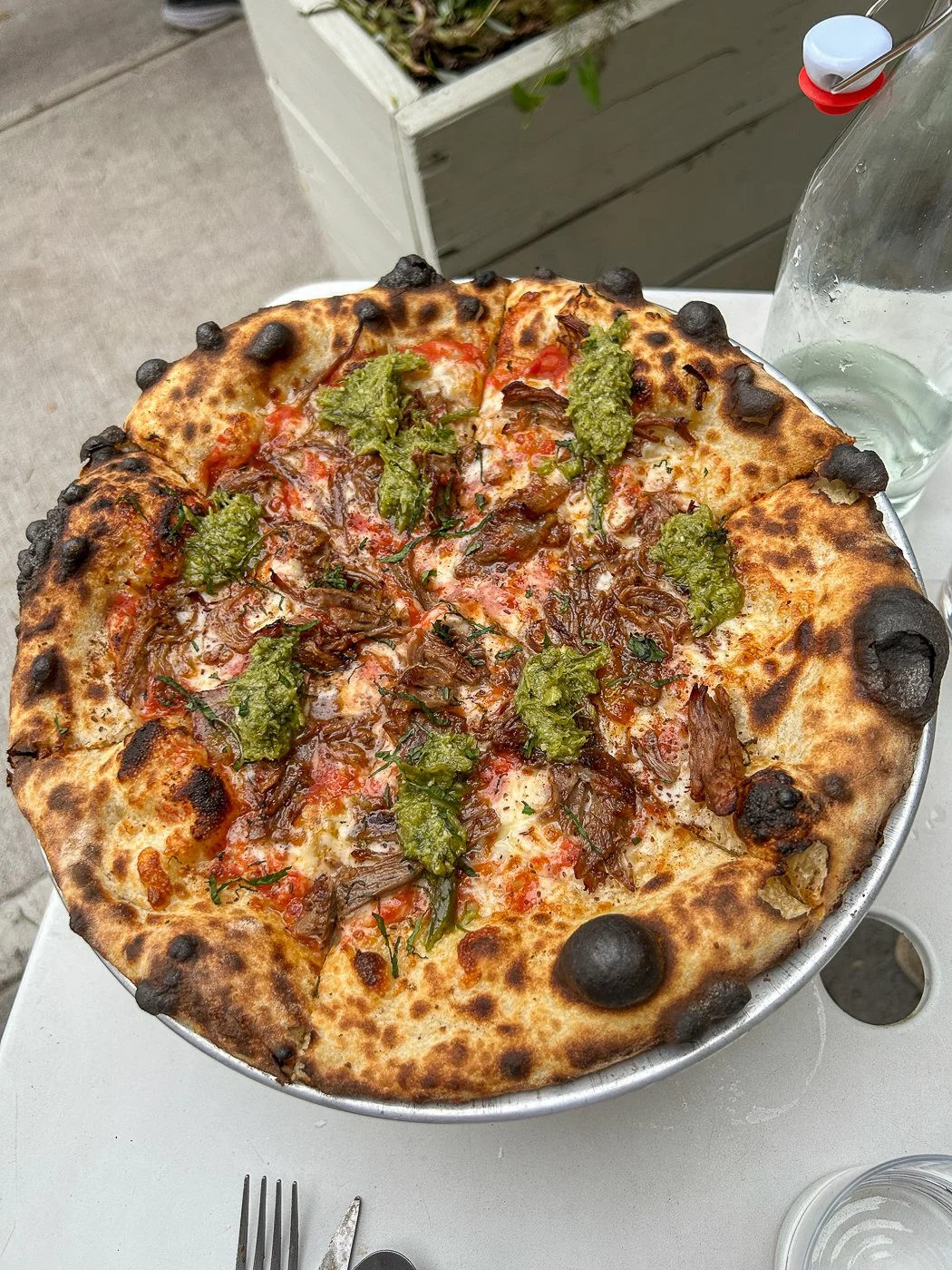 One time we had an incredible pizza with braised lamb (!) and mint pesto (!) on top: