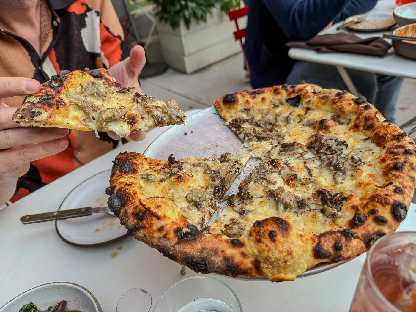 This time we got the more straightforward mushroom pizza, which isn’t really straightforward with its panoply of exotic mushrooms on top: