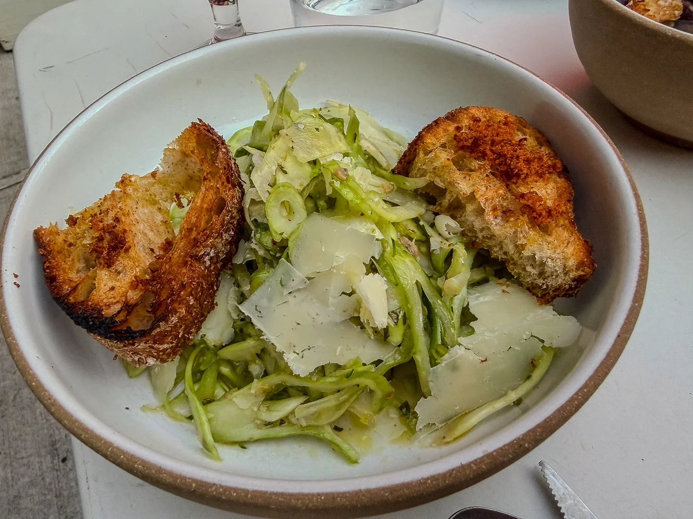 On our most recent visit, we shared the puntarelle salad: a rare-for-the-U.S. Italian bitter green that’s often served with anchovies; here it was served with bottarga toast.