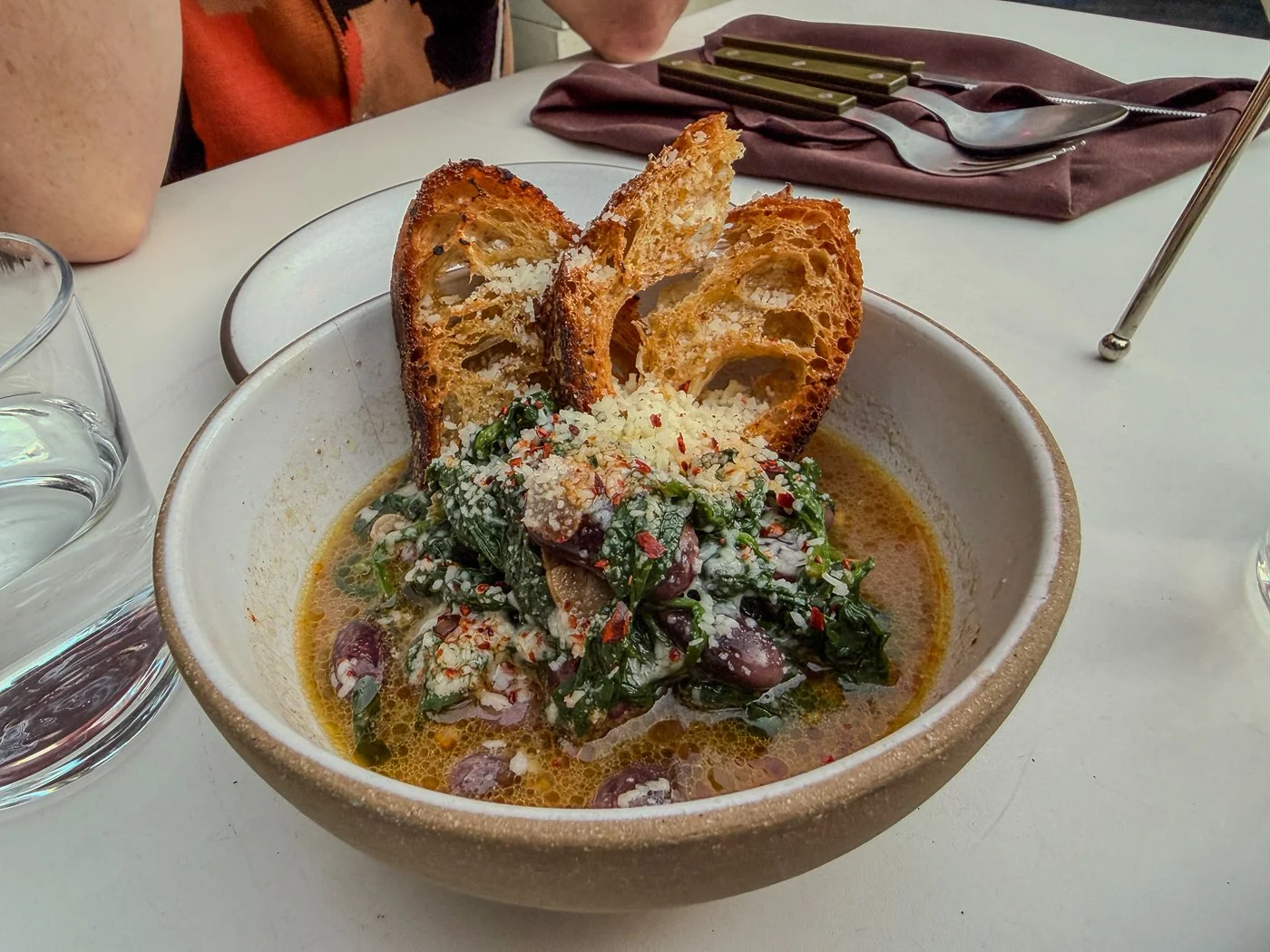 We also ordered these Scarlett runner beans — they’re big on beans at Frank’s — served in a sumptuous broth with lots of hearty cooked greens.