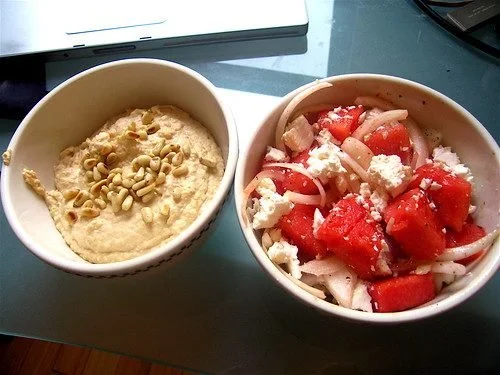 Try adding some cumin to the hummus, too; it’s a super-tasty addition!Just had that watermelon/feta/onion/minty salad for dinner, VERY nice. Just had some rice w/ raw veggies on the side, perfect summer eats.