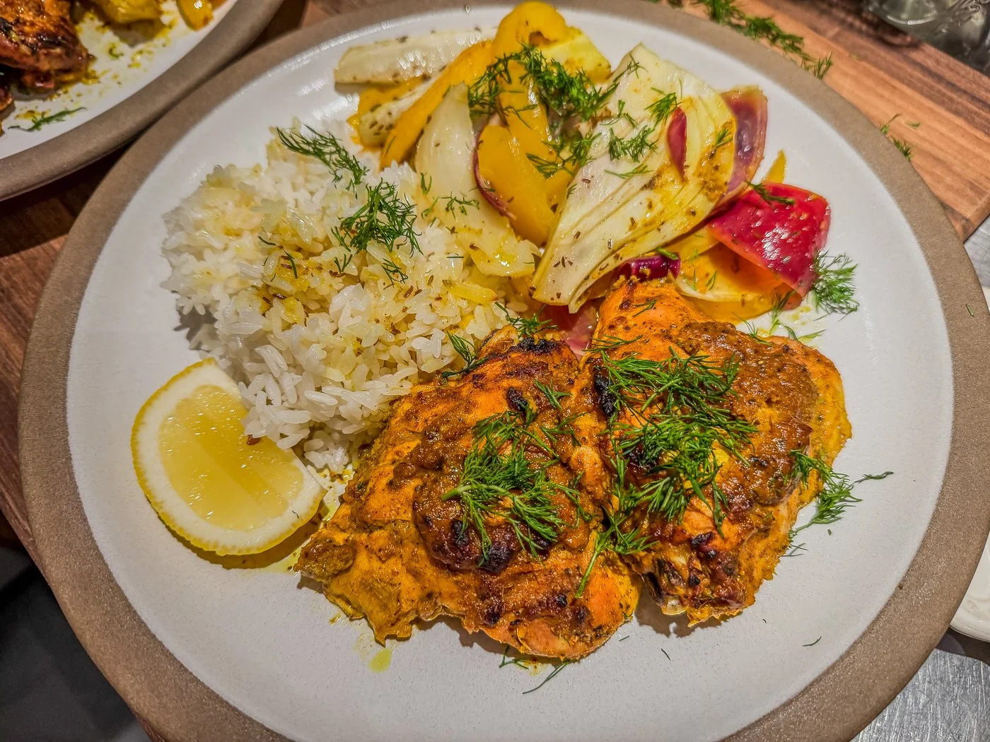 To serve, I scooped some rice on to plates, added the chicken, the veg, some of the sauce at the bottom of the roasting pan plus a lemon wedge and a sprinkling of dill.