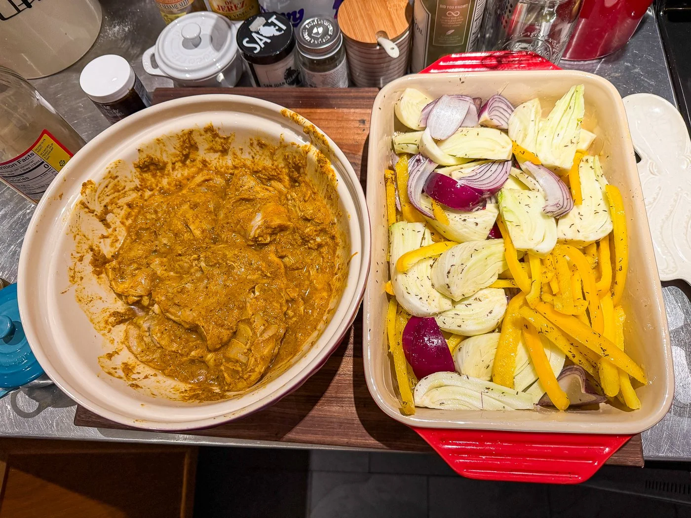 You massage that into the chicken — oh he has you cut slits into the chicken, so the marinade can really get it in there — and then let it marinate for two hours in the fridge (I did one hour at room temp). If the recipe were just that and that alone, it would be good. But then he has you make a bed of vegetables with the unexpected combination of fennel, red onion, and yellow pepper. This may be the first recipe I’ve made in almost twenty years that calls for yellow pepper. You also add cumin seeds.