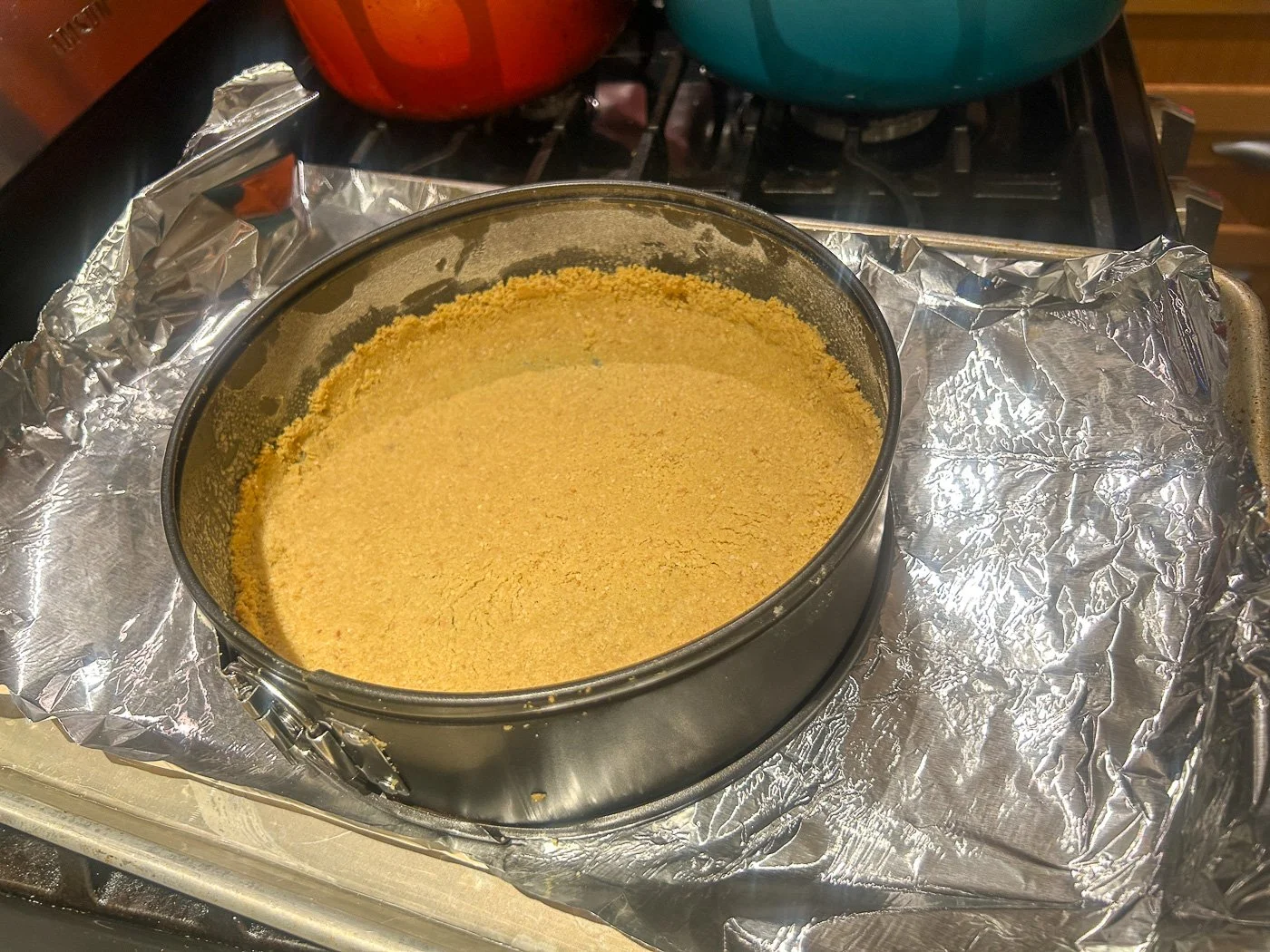 - To form the crust, press the mixture onto the bottom and about an inch up the sides of the springform pan. Place the pan in the refrigerator for 15 to 20 minutes to firm up the crust, then bake for 10 to 15 minutes, or until the crust is light golden brown. Remove the pan from the oven and allow the crust to cool completely on a wire rack.