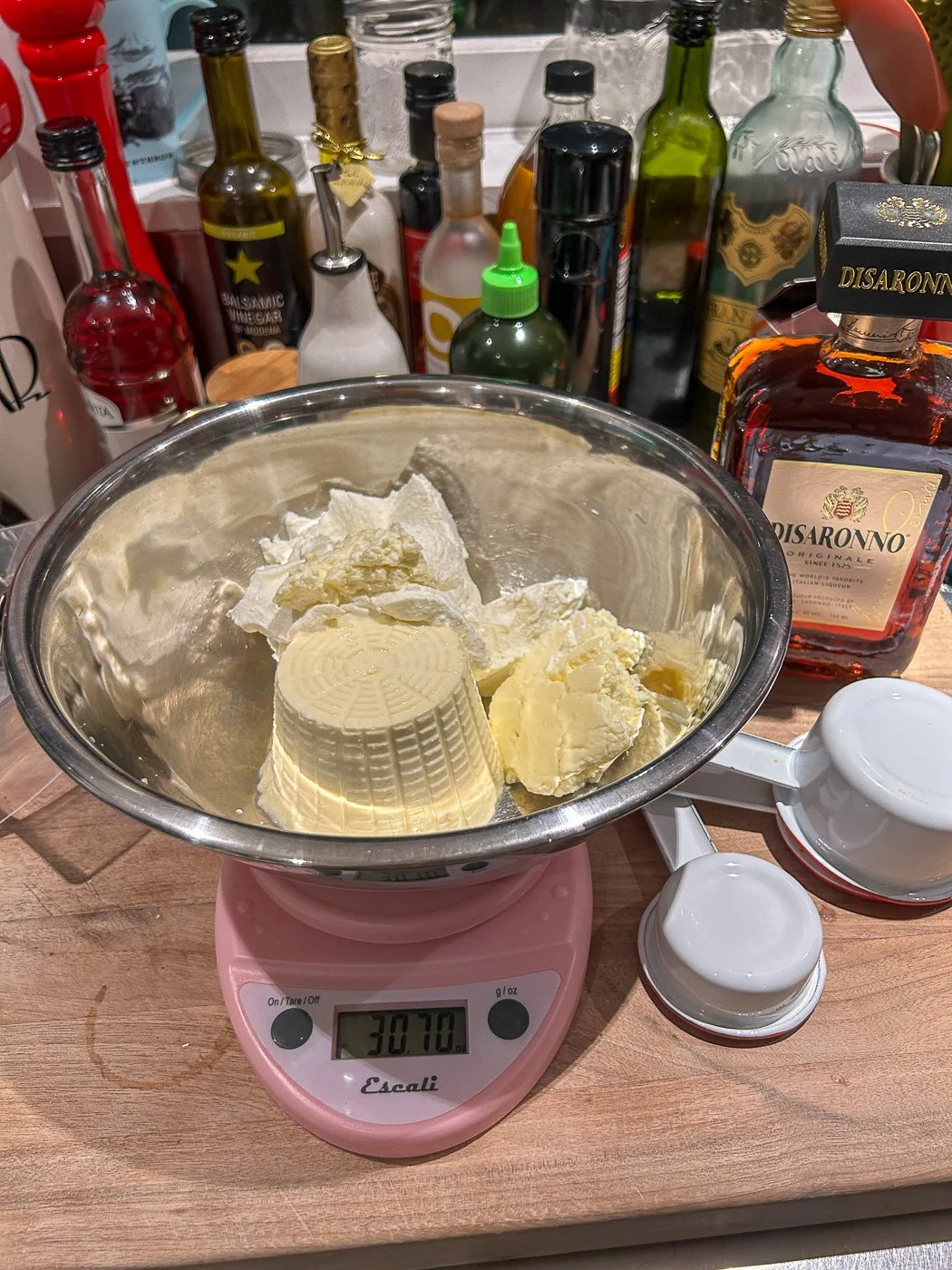 Oops! Well, that’s true that I made her updated cheesecake, but I hadn’t made the cheesecake in the book . The difference is that the updated cheesecake has no crust — it’s pure ricotta. The crust in the book version is a nice addition, especially because the toasted almond flavor echoes the toasted almond in the Amaretto. It’s just a little more work.