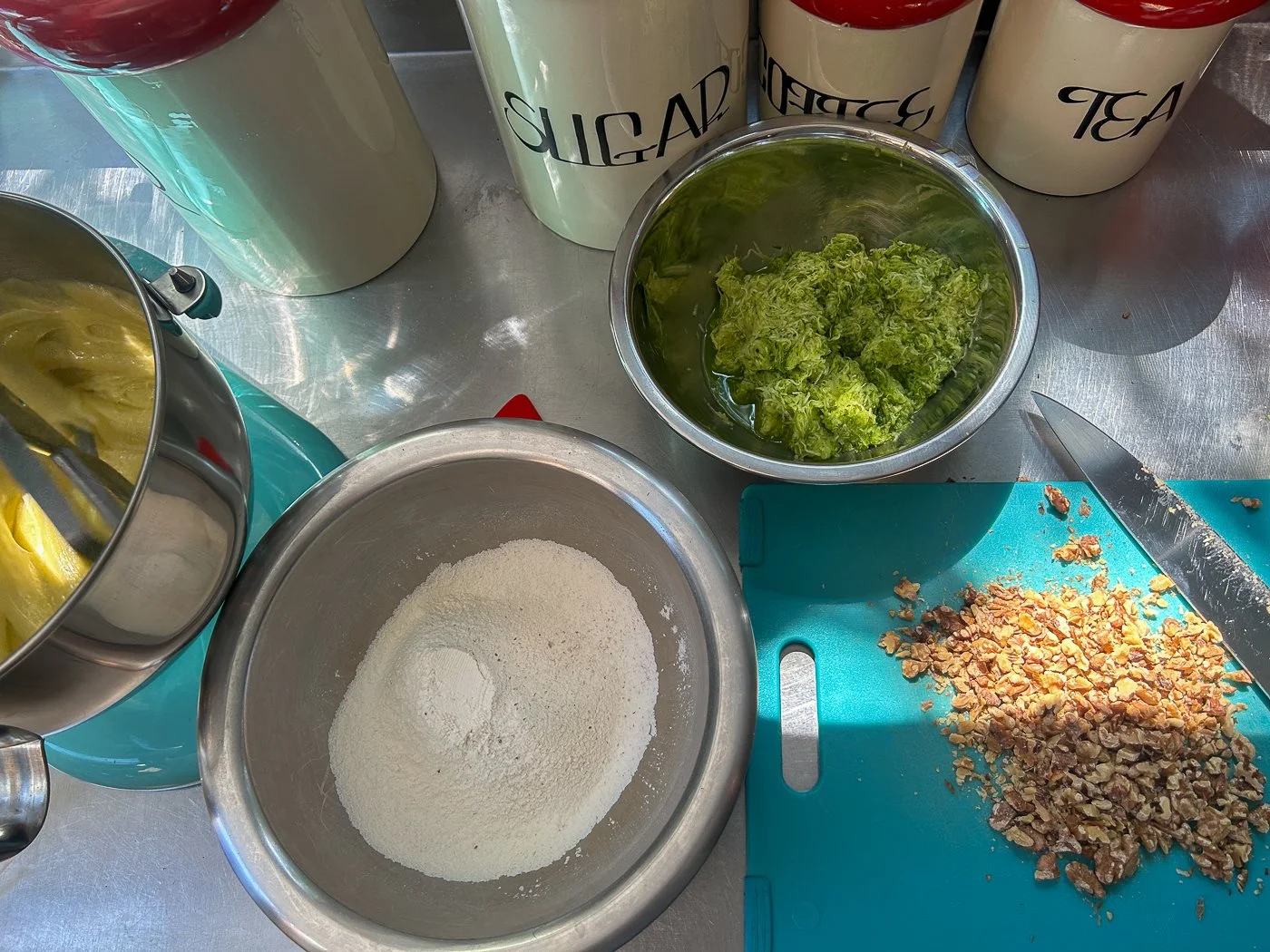 Sift the flour, baking powder, baking soda, salt, and spices into a medium bowl and set aside. In an electric mixer fitted with the paddle attachment, beat the eggs, sugar, and olive oil together on medium speed until light and fluffy, about 3 minutes, then beat in the vanilla extract. Scrape down the sides of the bowl with a spatula after each addition. Beat in the dry ingredients all at once on low speed until they are thoroughly combined, then switch the mixer to medium speed and mix for 30 seconds. Beat in the zucchini and the walnuts on low speed until they are completely incorporated, scraping down the sides of the bowl.