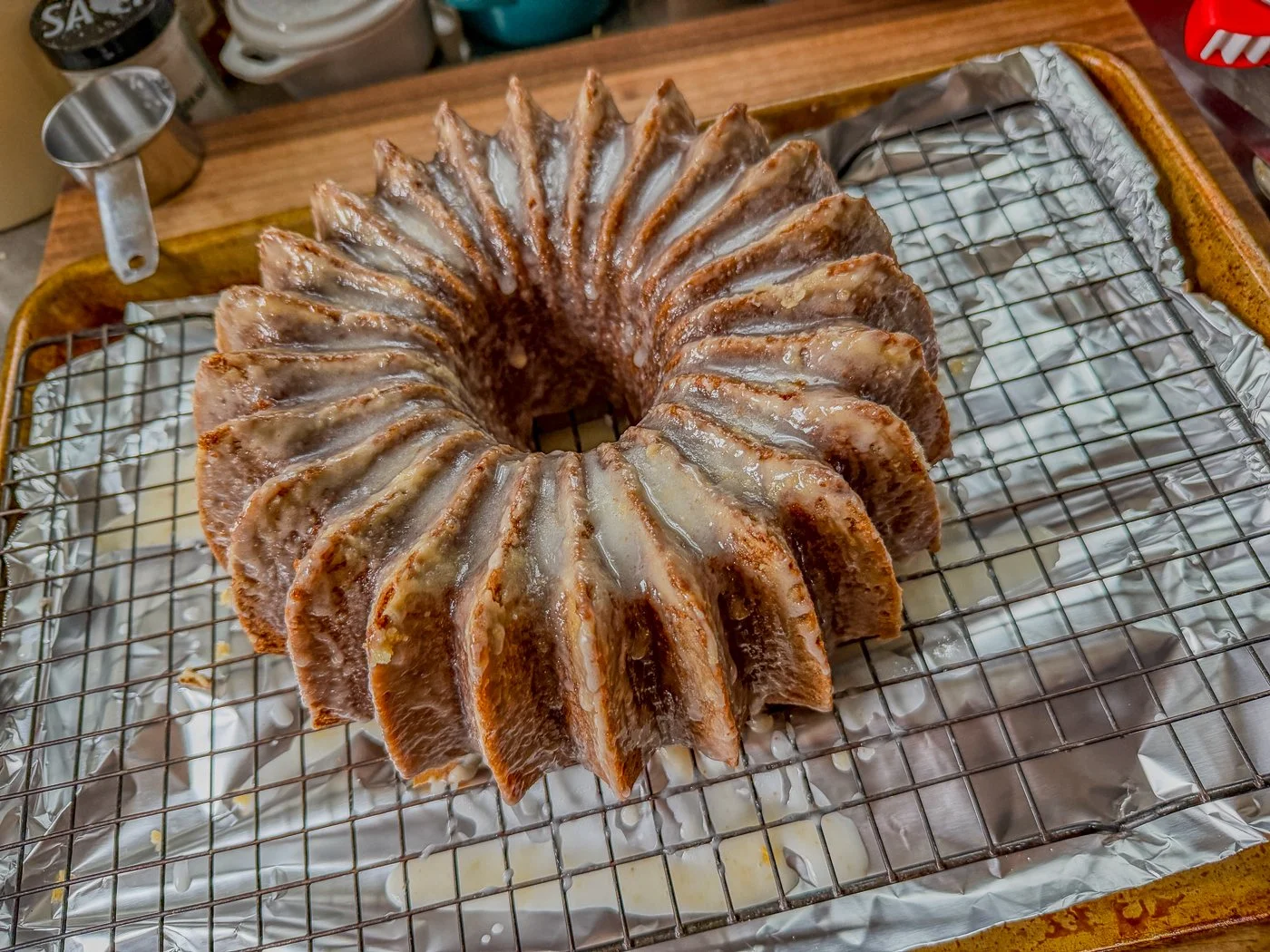 To make the cake: preheat the oven to 350 F and position a rack in the center. Grease a 10-cup Bundt pan using nonstick cooking spray or butter, then dust it with flour to coat it completely, tapping out the excess flour. (Really take care here: you don’t want your cake to stick!)