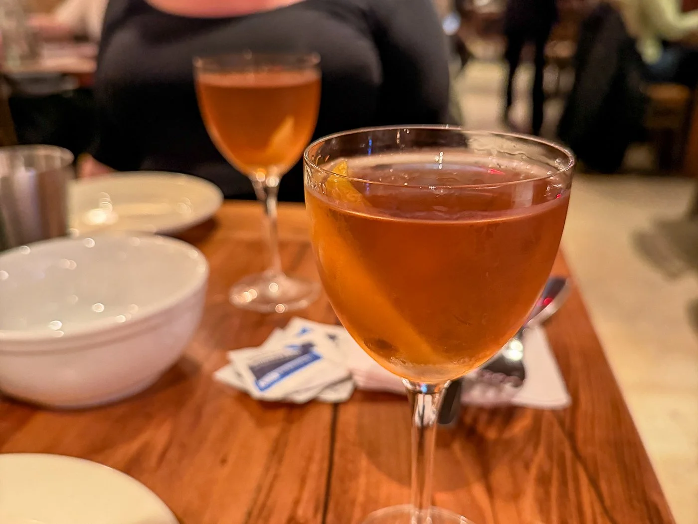 Deb and I decided to start with the “Toasted Rice Martinez,” a cocktail made with “scorched rice-infused Ford’s gin, Cocchi Torino, and Madeira.”