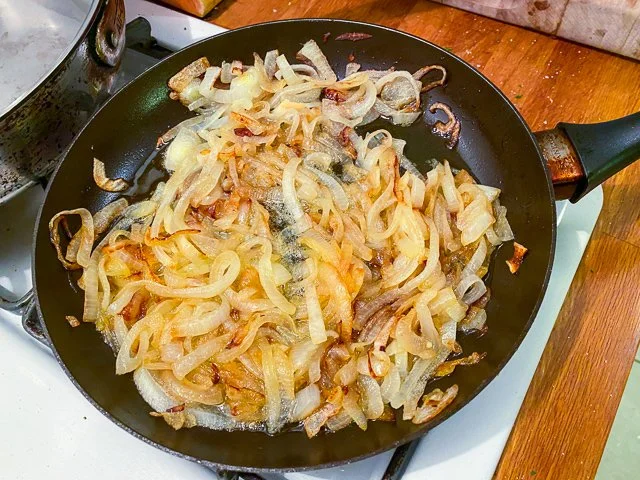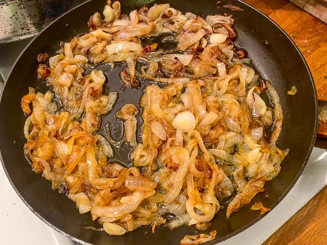 The process goes like this: you take two small yellow onions, or one large one, peel and slice them thin then caramelize them slowly in butter and olive oil. Let’s say two tablespoons of each. You start on high heat with a pinch of salt and then, when you’ve got some color (see above), you crank the heat to medium/low and cook, slowly (you should hear a gentle sizzle) for 45 minutes or longer. You want the onions deep, deep golden brown, like below.