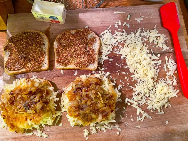 Bread-wise, I like sourdough. Spread a thick layer of grainy mustard on one side (that’s where you get your acidic pop in this version), add a mound of grated sharp white cheddar (my preferred cheese to the Gruyère; also, you’re more likely to have it around), and then top with the caramelized onions.