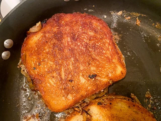 Sometimes the passing of recipes is like a game of telephone; something gets lost in translation. I’m sure Nancy has good reason for marinating her onions, but in my own attempts to recreate her signature grilled cheese, I started caramelizing the onions.