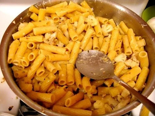 9. When the pasta’s done cooking (start tasting it after 5 minutes; it should be pretty al dente when you add it to the cauliflower mixture) lift the cooked pasta into the cauliflower using a slotted spoon or, much better, a spider. (You can buy them in Chinatown for $5.)