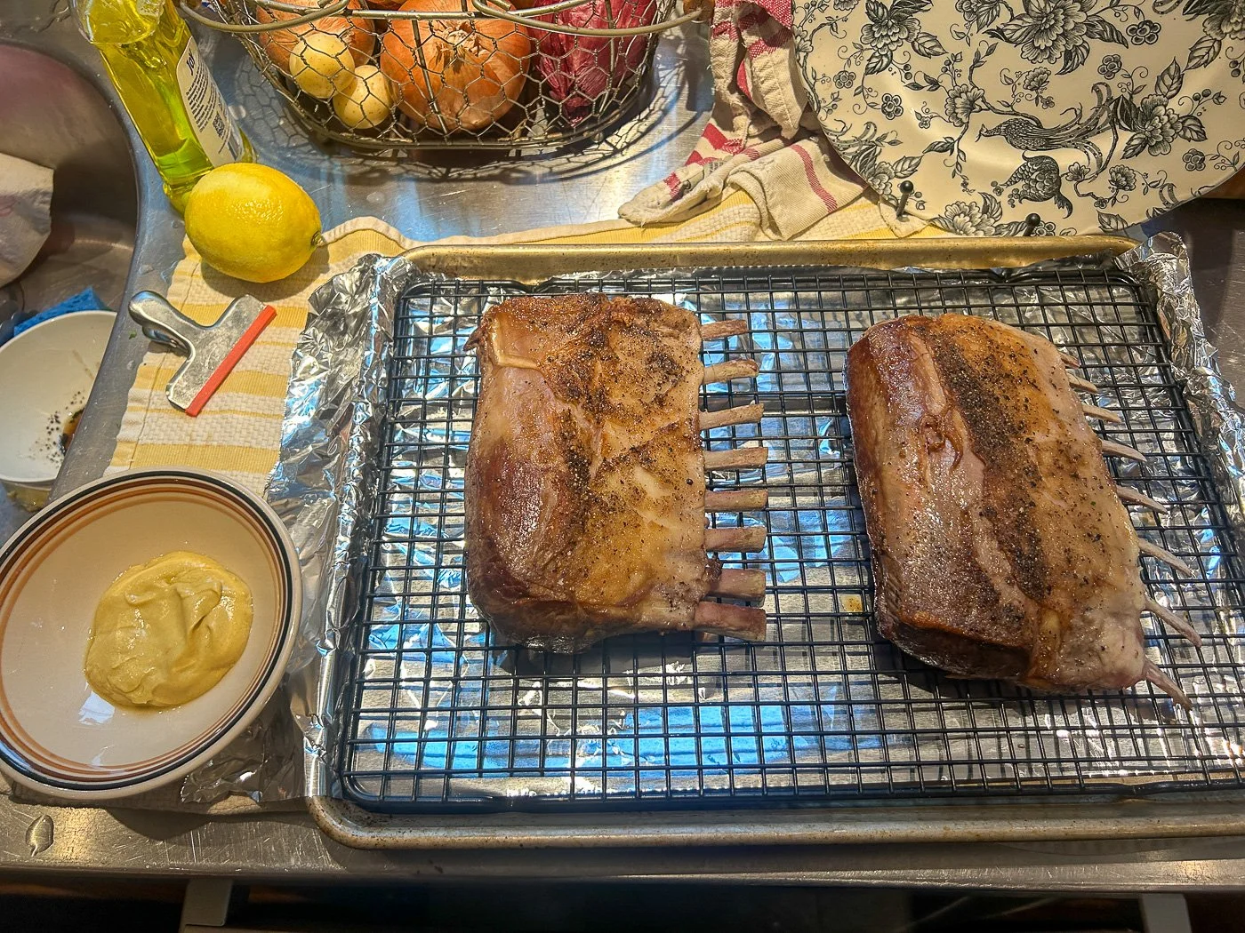 Roast in the 300 oven for 40 minutes or so and start checking the temperature a bit earlier. You want it to hit 125 for pink inside. Remove from the oven and lift the racks on to a cutting board and allow to rest for 15 minutes. Carve the racks between the bones with a sharp knife and serve right away.