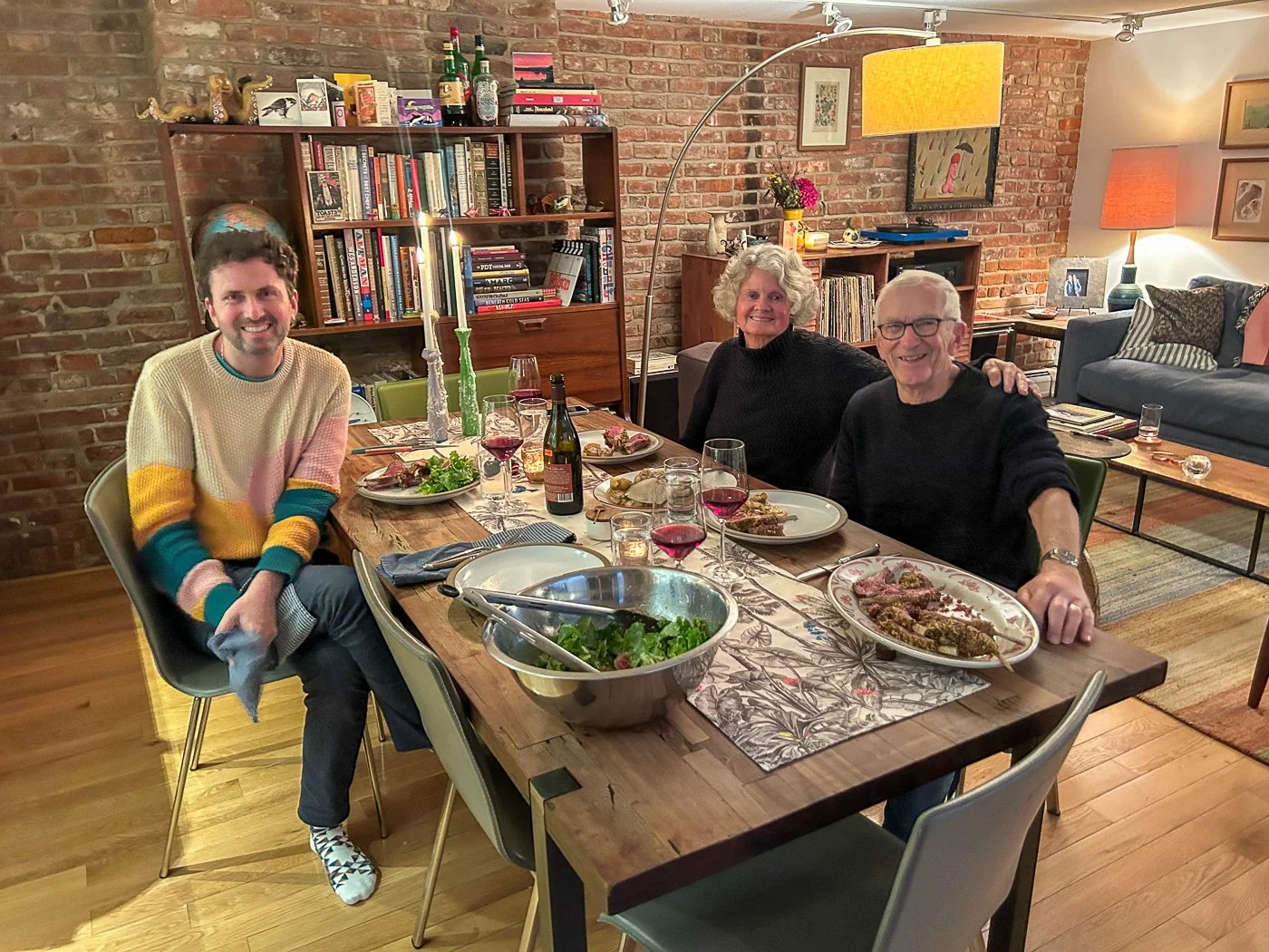 I served it with smashed and fried Yukon gold potatoes and a little salad with watermelon radishes. Here’s the happy family at the table.