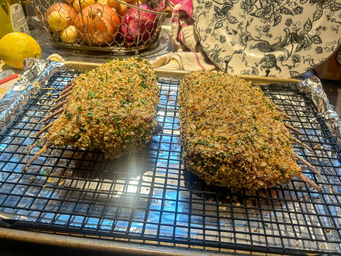 Then I brushed everything with Dijon mustard and, having placed the toasted Panko in a 9X13 pan (and mixed it with lemon zest and parsley), I simply pressed the racks into the Panko all over and then returned them to a cookie sheet fitted with a wire rack.