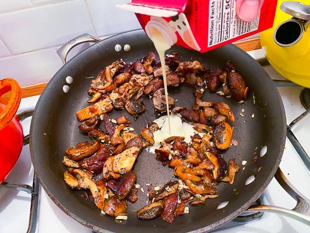 At this juncture, I tasted and felt like it could use a little fruity acid, so I added a splash of balsamic vinegar. If I had to do it all over again, I’d add the vinegar before the cream, but it really didn’t matter. Just be sure to taste here: add more salt, pepper, balsamic, as you need to in order to make it taste dreamy.